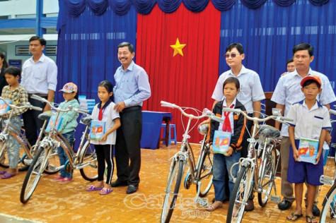 Phó tổng biên tập báo Cà Mau Nguyễn Quốc Danh (thứ 2, bìa phải) cùng ông Lê Thanh Hải, Chủ tịch Công ty Xổ số Cà Mau (thứ 3, bìa phải) trao xe đạp cho học sinh nghèo xã Biển Bạch. |