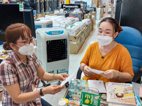 | Đại lý thu BHXH thị trấn Thới Bình (bên trái) tuyên truyền chính sách BHXH tự nguyện, BHYT cho chủ cửa hàng điện máy tại thị trấn. |