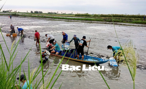 Nông dân xã Vĩnh Lộc A (huyện Hồng Dân) thu hoạch tôm trên đất lúa.