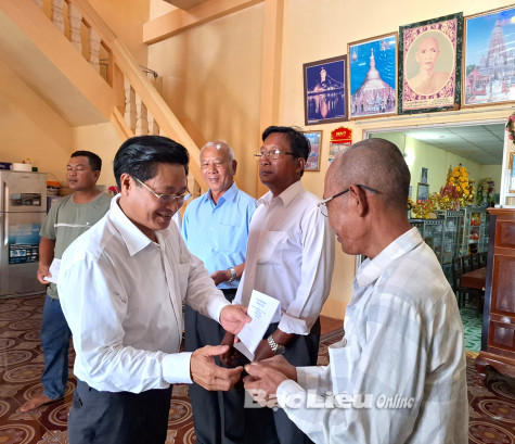 Ông Bùi Tấn Bảy - Phó Chủ tịch HĐND tỉnh tặng quà cho người có uy tín, hộ gia đình chính sách người Khmer ở xã Vĩnh Trạch Đông (TP. Bạc Liêu) nhân dịp tết Chôl-chnăm-thmây 2024.