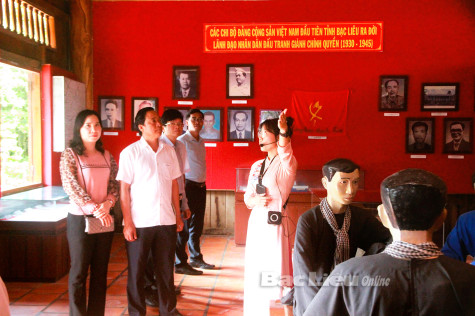 Lãnh đạo Ban Tuyên giáo Tỉnh ủy nghe giới thiệu về Di tích lịch sử quốc gia Nơi thành lập Chi bộ Đảng đầu tiên của tỉnh Bạc Liêu tại ấp Rạch Rắn, xã Long Điền, huyện Đông Hải, tháng 7/2022. Ảnh: N.Q
