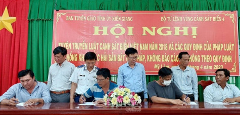 Cũng trong sáng nay (24/4), Bộ Tư lệnh Vùng Cảnh sát biển 4 phối hợp với Ban Tuyên giáo Kiên Giang tổ chức tuyên truyền Luật Cảnh sát biển Việt Nam năm 2018 và phổ biến pháp luật về chống khai thác hải sản bất hợp pháp, không báo cáo và không theo quy định (IUU) cho bà con ngư dân trên địa bàn 3 huyện Hòn Đất, An Biên và An Minh (tỉnh Kiên Giang).