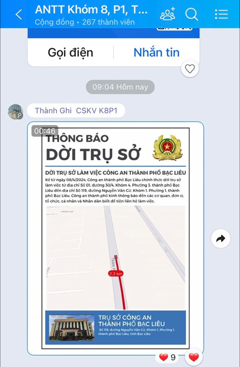 Tại địa bàn Phường 1 (TP. Bạc Liêu), người dân đều được mời tham gia vào nhóm Zalo an ninh trật tự (ANTT) của khóm do Cảnh sát khu vực (CSKV) làm trưởng nhóm. Nhờ có nhóm Zalo này, tất cả các thông tin về tình hình ANTT, các thông báo của Công an Phường 1 đều được CSKV cập nhật thường xuyên. Đây cũng là một cách làm hay để gắn kết các thành viên trong cộng đồng dân cư, đồng thời cũng là cách để lực lượng công an cơ sở nâng cao vai trò của mình trong quản lý địa bàn.