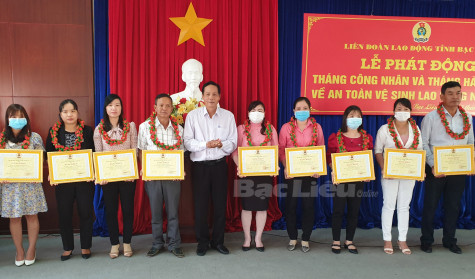 LĐLĐ tỉnh khen thưởng cho những cá nhân có sáng kiến tiêu biểu tại Lễ phát động Tháng Công nhân năm 2021. Ảnh: H.U