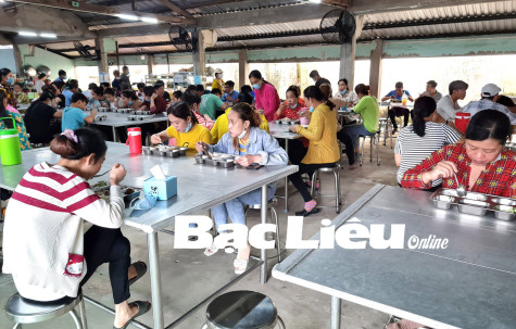 Xác định chất lượng bữa ăn đóng vai trò quyết định đến việc bảo đảm dinh dưỡng và sức khỏe lâu dài cho NLĐ, Công ty Cổ phần Chế biến và Dịch vụ thủy sản Cà Mau - Chi nhánh Bạc Liêu (đóng tại huyện Đông Hải) hỗ trợ tiền ăn cho NLĐ trên 20.000 đồng/ngày/bữa trở lên. Để đảm bảo chất lượng bữa ăn ca hằng ngày cho 350 lao động, công ty thường xuyên cử người tham gia công tác giám sát, kiểm tra chặt chẽ ở tất cả các khâu nhằm kịp thời chấn chỉnh khu vực nấu và người tham gia nấu ăn. Số lượng thực phẩm chế biến được tính toán chặt chẽ, sát với nhu cầu để sử dụng hết trong ngày, không tồn đọng và sử dụng lại. Bên cạnh việc yêu cầu mua thực phẩm đầu vào có nguồn gốc rõ ràng, công ty còn đa dạng thực đơn hằng ngày để bảo đảm sức khỏe cho NLĐ.