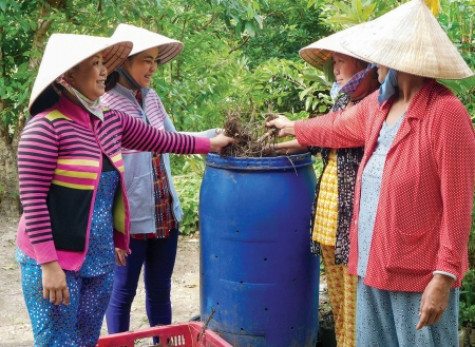 | Ủ phân từ rác thải, lá cây, chị em hội viên phụ nữ tận dụng nguồn phân trồng rau màu. |