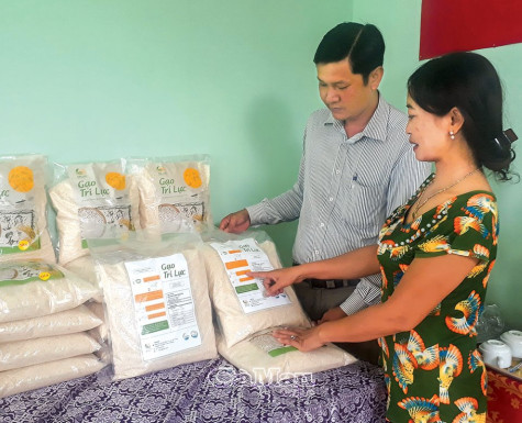 | Gạo của xã Trí Lực được đóng gói, có nhãn mác để xuất ra thị trường. |