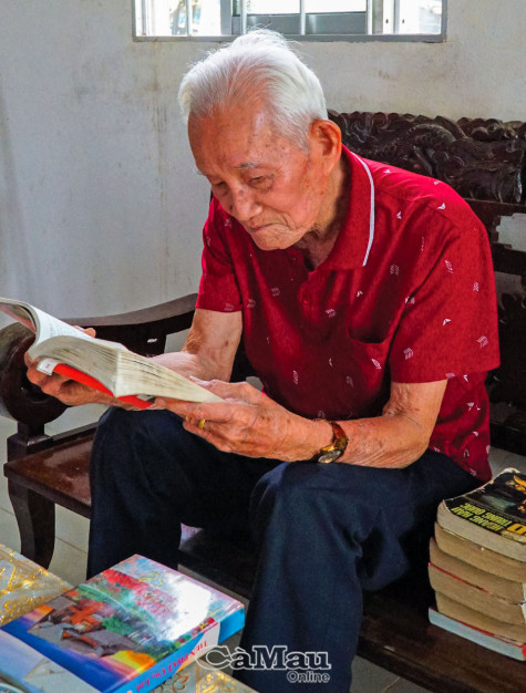 | Dù tuổi đã cao nhưng hàng ngày ông Hai Phát vẫn cặm cụi đọc sách và xem sách như người bạn tri kỷ của mình. |