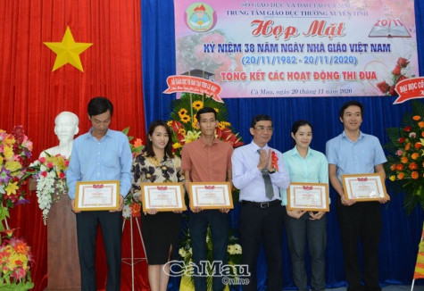 Tiến sĩ Lê Hoàng Dự, Phó giám đốc Sở Giáo dục và Đào tạo, trao giấy khen cho các học viên đạt thành tích cao trong học tập và Hội thi “Học tập và làm theo Bác” do Trung tâm Giáo dục thường xuyên tỉnh tổ chức dịp 20/11/2020.