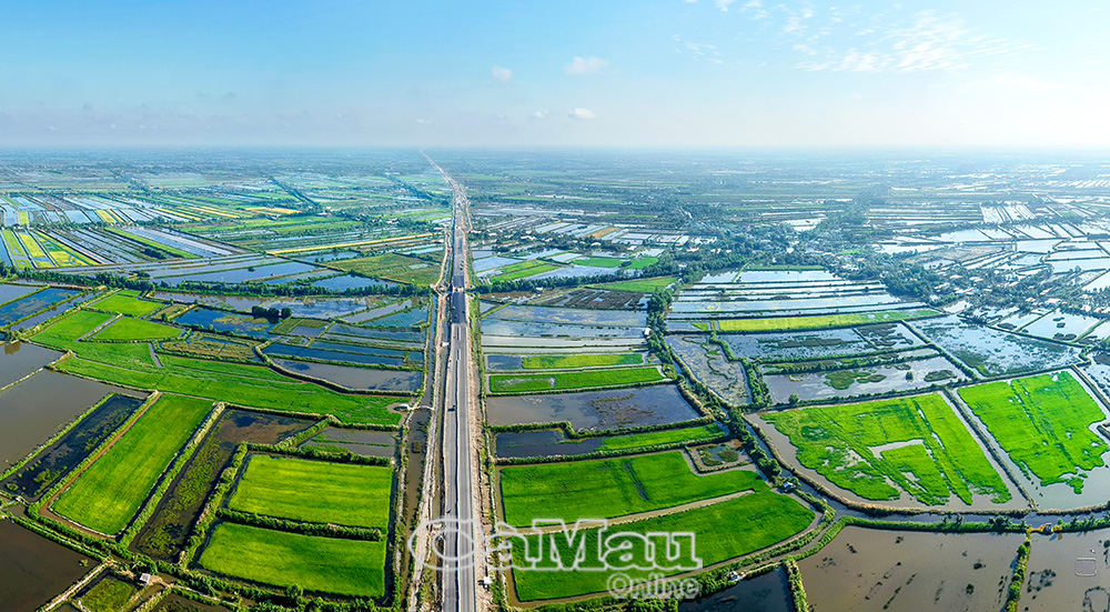 Tuyến cao tốc trên địa bàn tỉnh Cà Mau vượt qua những cánh đồng lúa - tôm, tạo nên nét đẹp đặc trưng. (Ảnh chụp trên địa bàn Xã Hồ Thị Kỷ).