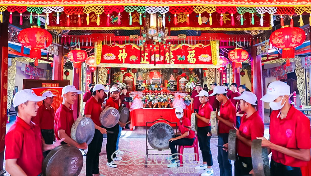 Tổ chức nhạc lễ cung chúc chư thần trong dịp lễ cúng cuối năm ở Phước Đức Cổ Miếu, phường Bạc Liêu. Ảnh: GIA LỘC