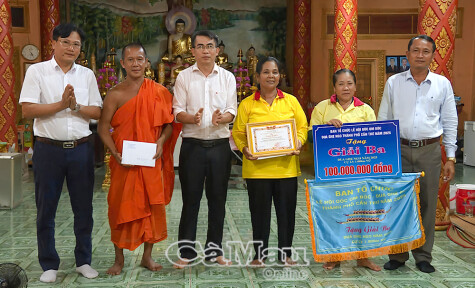 Đồng chí Hà Tấn Linh, Bí thư Đảng uỷ, Chủ tịch HĐND xã Hồng Dân (thứ 3, từ trái sang) cùng với các đồng chí Nguyễn Đồng Khởi, Phó Chủ tịch UBND xã (bìa trái); Danh Sơn, Chủ tịch MTTQ Việt Nam xã Hồng Dân (bìa phải) trao giấy khen, tiền thưởng cho Đội ghe Ngo nữ và Ban Quản trị chùa Ngan Dừa.