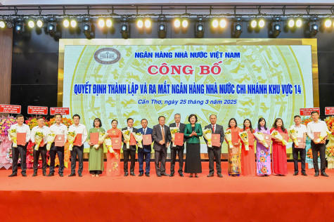 Sáng 25/3, Ngân hàng Nhà nước (NHNN) Việt Nam tổ chức công bố quyết định thành lập và ra mắt Ngân hàng Nhà nước chi nhánh Khu vực 14, được đặt tại TP. Cần Thơ, trên cơ sở hợp nhất 5 chi nhánh tỉnh thành gồm Cần Thơ, Hậu Giang, Sóc Trăng, Bạc Liêu và Vĩnh Long. Đồng thời, Giám đốc, Phó Giám đốc NHNN khu vực này cũng được công bố (ảnh).