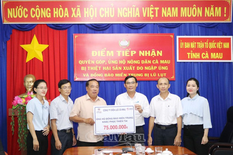 Mưa bão, lũ lụt, sạt lở đất không chỉ gây ra những thiệt hại to lớn về người, tài sản cho đồng bào miền Trung mà trên địa bàn tỉnh Cà Mau, đợt mưa cùng với triều cường dâng cao vừa qua đã gây ngập úng, thiệt hại hàng chục ngàn héc-ta lúa, hoa màu, cây ăn trái, sạt lở và hư hỏng nhiều tuyến đường giao thông, ảnh hưởng nghiêm trọng đến đời sống Nhân dân. Hưởng ứng lời kêu gọi của Tỉnh uỷ, HĐND, UBND, Uỷ ban MTTQ Việt Nam, Công ty Điện lực Cà Mau đã ủng hộ nông dân Cà Mau bị thiệt hại sản xuất do ngập úng và đồng bào miền Trung bị lũ lụt số tiền 75 triệu đồng.