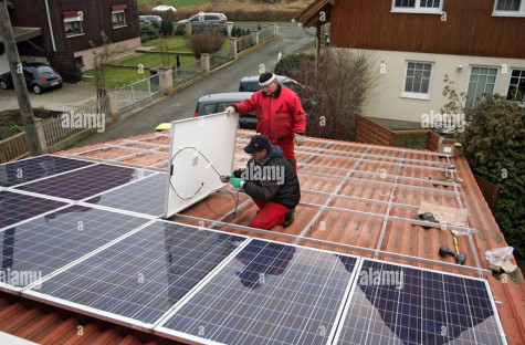 Thợ điện lắp đặt hệ thống năng lượng mặt trời trên mái của một ngôi nhà ở Magdeburg, Đức. Ảnh: Alamy