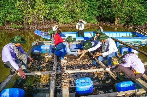 | Du khách tham quan nghề nuôi hàu ở Đất Mũi, huyện Ngọc Hiển, tỉnh Cà Mau. |