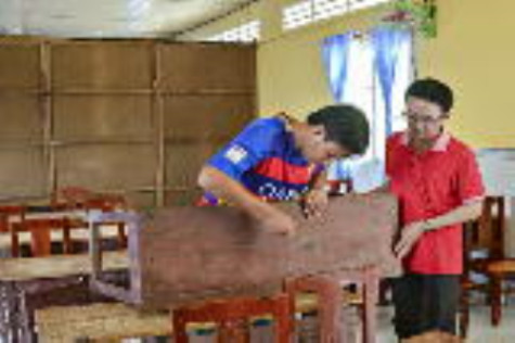 Giáo viên Trường Tiểu học Cái Keo sửa chữa bàn ghế cũ chuẩn bị cho năm học mới. |