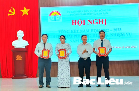 Lãnh đạo huyện Đông Hải khen thưởng cho các tập thể có thành tích tiêu biểu trong năm học 2022 - 2023. Ảnh: Đ.K.C