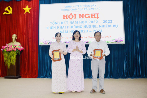 Lãnh đạo Sở GD-ĐT cùng lãnh đạo huyện Hồng Dân tặng giấy khen và bảng tuyên dương cho các tập thể, cá nhân hoàn thành xuất sắc nhiệm vụ năm học 2022 - 2023. Ảnh: C.K