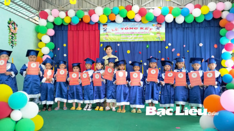 Trẻ lớp Lá Trường mẫu giáo xã Vĩnh Phú Tây (huyện Phước Long) nhận Chứng nhận hoàn thành chương trình cho trẻ mẫu giáo 5 tuổi, năm học 2022 - 2023.