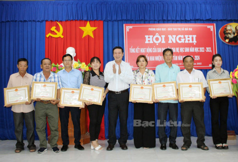 Lãnh đạo Phòng GD-ĐT trao giấy khen của Chủ tịch UBND TX. Giá Rai cho Ban đại diện Cha mẹ học sinh các trường có thành tích tốt trong công tác phối hợp. Ảnh: C.K