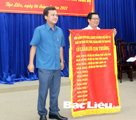 Cụm thi đua các Sở Nội vụ khu vực miền Tây Nam Bộ ký kết giao ước thi đua và trao cờ luân lưu năm 2022. Ảnh: K.P
