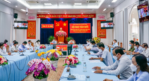 | Chủ trì hội nghị tại điểm cầu Cà Mau có đồng chí Nguyễn Tiến Hải, Uỷ viên BCH Trung ương Đảng, Bí thư Tỉnh uỷ, Chủ tịch HĐND tỉnh; đồng chí Hồ Trung Việt, Uỷ viên BTV Tỉnh uỷ, Trưởng ban Tuyên giáo Tỉnh uỷ. |
