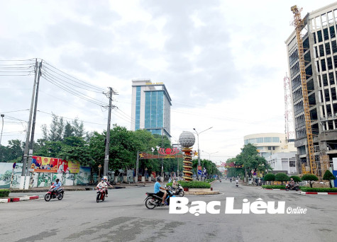 Lượng phương tiện tham gia giao thông trên các tuyến đường chính của TP. Bạc Liêu thưa vắng trong ngày đầu thực hiện giãn cách xã hội. Ảnh: C.K