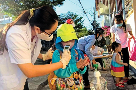Hơn 80% trẻ đã trở lại học tập tại Trường Mầm non Hoàng Oanh, Phường 5, TP Cà Mau. (Ảnh: Các bé được đo thân nhiệt và hướng dẫn rửa tay khử khuẩn trước khi vào lớp). |