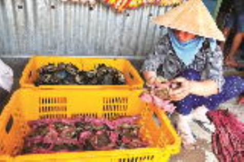 Thương lái thu mua cua Cao Trường Ngoãn, xã Hoà Mỹ, huyện Cái Nước, cho biết: “Trung bình mỗi ngày phải thuê 4-5 công nhân trói, phân cỡ cua. Còn vào những con nước chính, lượng cua nhiều, có khi trên 1 tấn cua/ngày, phải thuê 8-9 nhân công làm mới kịp xuất bán”.