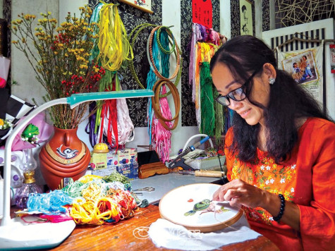 | Chị Phạm Trần Bửu Trâm hạnh phúc khi được thoả niềm đam mê, sản phẩm thêu tay trên đầm và áo dài cách tân. |