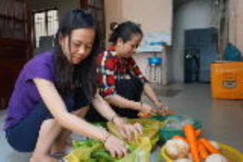 | Nghi cùng mẹ chuẩn bị nấu ăn cho Trung tâm Nuôi dạy trẻ khuyết tật, mồ côi Nhân Ái. |