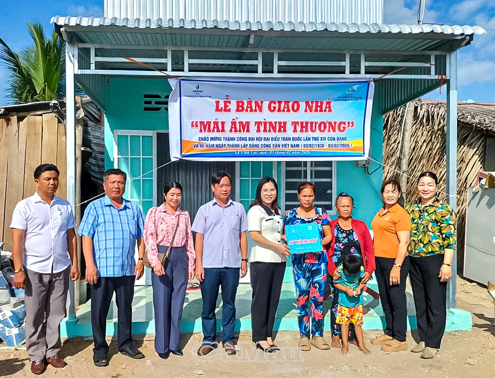 Phó Bí thư Tỉnh đoàn Cà Mau Nguyễn Trang Anh Thư (thứ hai từ trái sang) và Hoà thượng Thích Thiện Hảo, Phó ban Trị sự Giáo hội Phật giáo phường Thủ Đức, TP Hồ Chí Minh, bàn giao nhà cho gia đình đoàn viên Nguyễn Hồng Nhi (phường Vĩnh Trạch).