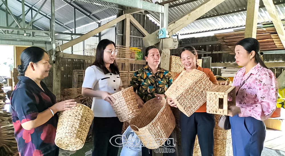 Đoàn tham quan các sản phẩm làm từ lục bình của chị Vũ Thị Cục.