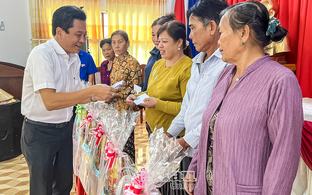 Đồng chí Lê Bình Nguyên, Phó Bí thư Đảng uỷ UBND tỉnh, trao quà Tết cho hộ nghèo trên địa bàn xã Tân Hưng. Ảnh: TRÚC LINH