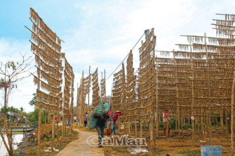 | Không khí lao động tất bật tại làng khô biển Cái Đôi Vàm, huyện Phú Tân. |