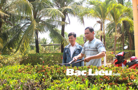 Ông Hồ Thanh Hiệp - Bí thư Chi bộ ấp Thạnh II (xã Long Điền, huyện Đông Hải) hướng dẫn hộ dân cắt tỉa hàng rào cây xanh. Ảnh: T.N