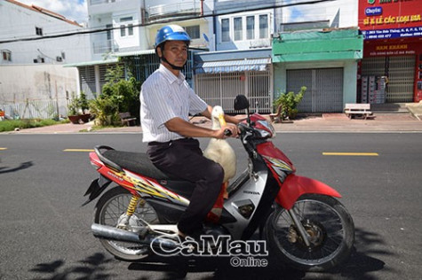“Con vịt này cũng mến chủ như con vịt trước, khi thấy tôi ra khỏi nhà là nó chạy theo. Lúc vịt còn nhỏ, tôi bỏ nó vào cái rổ mủ trước xe, đi thì chở nó theo, về thì chở nó về. Khi nó lớn, tôi chỉ cần trải miếng vải trên baga xe cho nó đứng không trơn vậy là chở đi”, anh Hoai thích thú khoe.