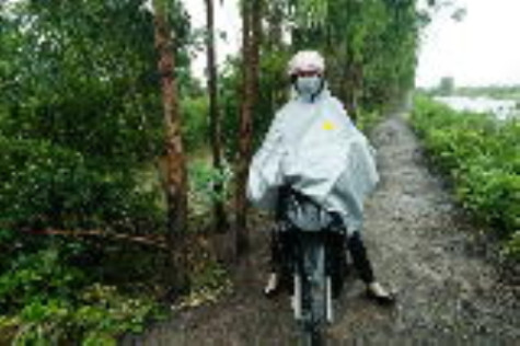 | Phía bên trái đường mòn này là con kinh Chanh (Chín Nhái), khô cạn vào lúc triều xuống, gây khó khăn cho người nuôi tôm nới đây. |