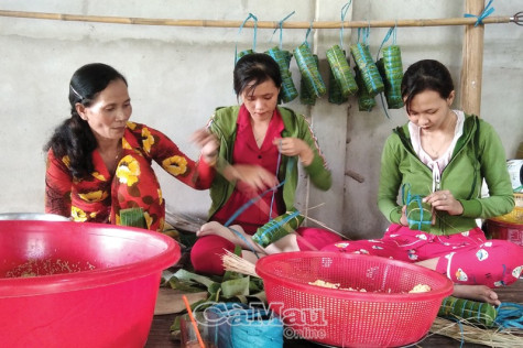 | Đồng bào Khmer gói bánh tét cúng ông bà trong ngày Sene Dolta. |