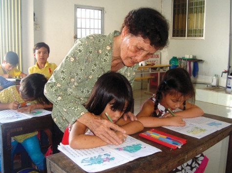 Lớp học tình thương vang xa tiếng đánh vần ê a của bọn trẻ hoà cùng tiếng gõ nhịp thước của một cô giáo già. Ngoài hành lang nhìn vào, hình ảnh đầu tiên bắt gặp là dáng vẻ của cô giáo đứng lớp với đôi vai nhỏ, mái tóc đã hoa râm. Giọng cô ấm áp, đôi tay có lúc hơi run nhưng khi cô viết chữ lên bảng thì lại rất đẹp và rõ nét.