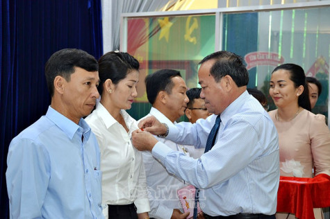 | Nguyên Phó bí thư Thường trực Tỉnh uỷ Cà Mau Phạm Bạch Đằng trao kỷ niệm chương cho các cán bộ tuyên giáo tại Cà Mau có nhiều thành tích. |