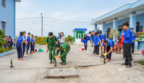 Đoàn viên, thanh niên và học sinh hào hứng tham gia các trò chơi dân gian trong khuôn viên Đồn Biên phòng Tân Tiến.