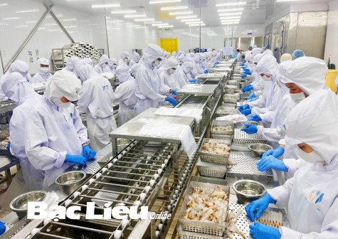 Chế biến tôm xuất khẩu ở Công ty Thái Minh Long (TX. Giá Rai). Ảnh: C.L