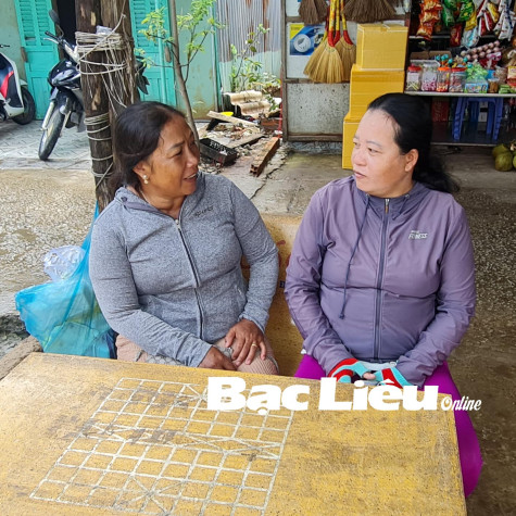 Chị Yến Linh (bên phải) chia sẻ những lần hiến máu của mình với Chi hội trưởng Chi hội Phụ nữ khóm Bờ Tây. Ảnh: T.Q