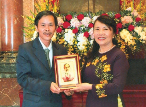 Thứ trưởng Bộ GD&ÐT Nguyễn Thị Nghĩa trao tặng chân dung Bác Hồ cho Nhà giáo Ưu tú Hoàng Văn Sum tại Lễ tuyên dương Nhà giáo tiêu biểu năm 2016, tại Hà Nội. |