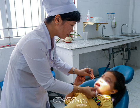 Bác sĩ Khoa Răng hàm mặt Bệnh viện Đa khoa Cái Nước thăm khám răng cho bệnh nhi. (ảnh minh hoạ)