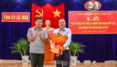 (CMO) Chiều 13/5, Đảng bộ Văn phòng Tỉnh uỷ Cà Mau tổ chức Lễ trao tặng Huy hiệu 40 năm tuổi Đảng đợt 19/5 cho đồng chí Phạm Bạch Đằng, nguyên Phó bí thư Thường trực Tỉnh uỷ.