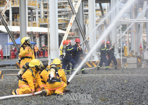 Tại 2 phân đoạn diễn tập, ngay sau sự khi cố xảy ra, lực lượng ứng cứu ban đầu của nhà máy có mặt, sử dụng các thiết bị chuyên dụng khống chế đám cháy, ngăn chặn nguy cơ cháy lan sang các khu vực lân cận.