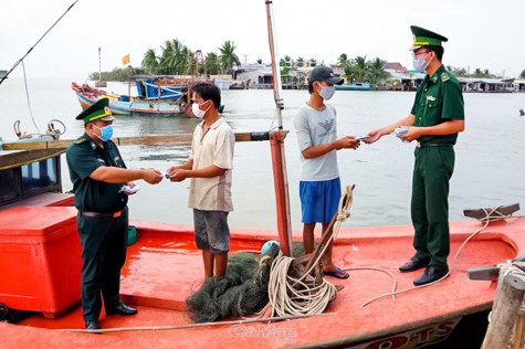 | Cán bộ Ðồn Biên phòng Khánh Hội phát khẩu trang y tế và động viên ngư dân thực hiện nghiêm thông điệp 5K trong phòng, chống dịch. |